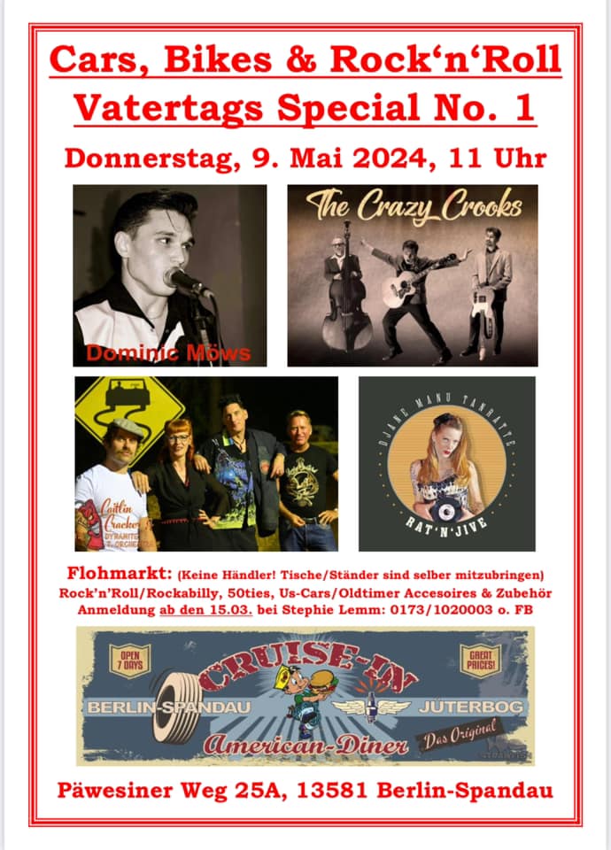 Floh-/Teilemarkt (Nur R‘n‘R, 50er Jahre, Motorrad, US-Cars & Oldtimer! Nur Privat, KEINE HÄNDLER!!!), Tische, Ständer, etc. sind selber mitzubringen! Aufbau muss um 11:00h fertig sein, danach keine Zufahrt mehr!
